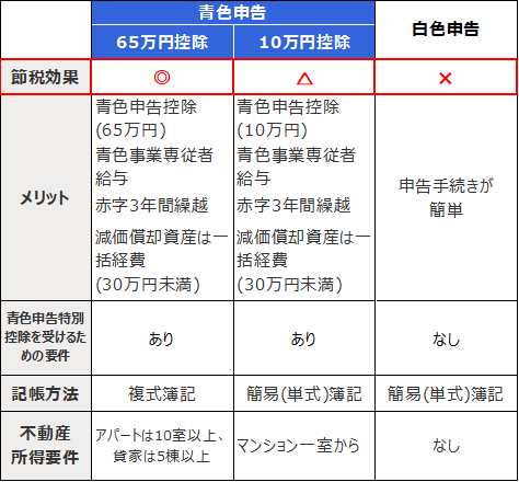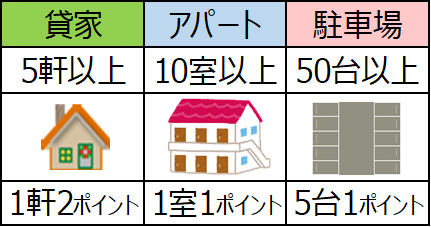 青色申告できるのは、事業所得・不動産所得・山林所得のある人のみで、それ以外の所得の場合は白色申告となります。節税効果の高い青色申告の65万控除を受ける為には、不動産所得要件として5棟10室以上(事業的規模)が条件となります。貸家だけなら5棟、アパートなら10室以上、駐車場も対象となり下の表で合計10ポイント以上あればOKです。